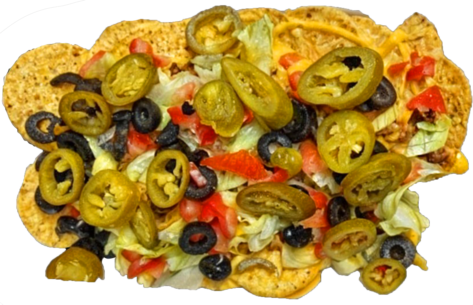 ground beef, lettuce, tomatoes, black olives, jalapenos & Naacho Cheese with a side of sour cream & salsa